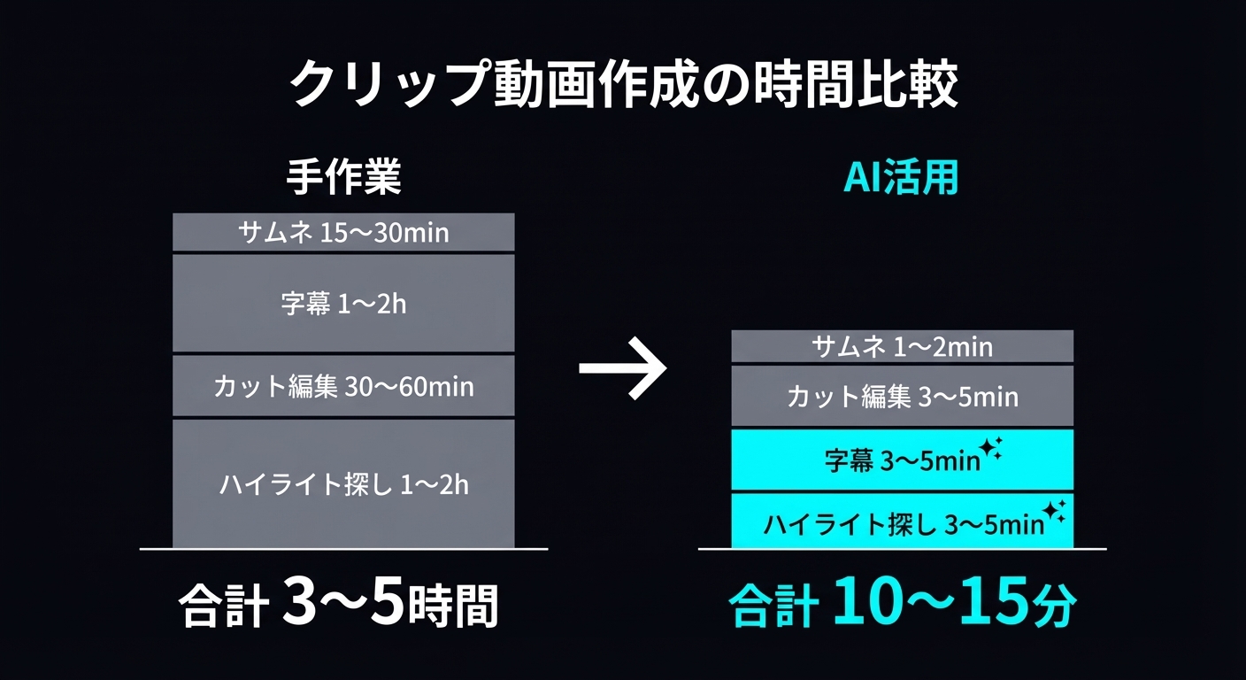 ツールによりますが、AIでハイライト検出から字幕生成まで自動化した場合、分析の待ち時間を含めて10〜15分程度です。ここにサムネイル作成やタイトルの検討、ハイライトの最終選定を加えると、全体で30分〜1時間ほどが目安です。手作業の3〜5時間と比べると大幅に短縮できます。