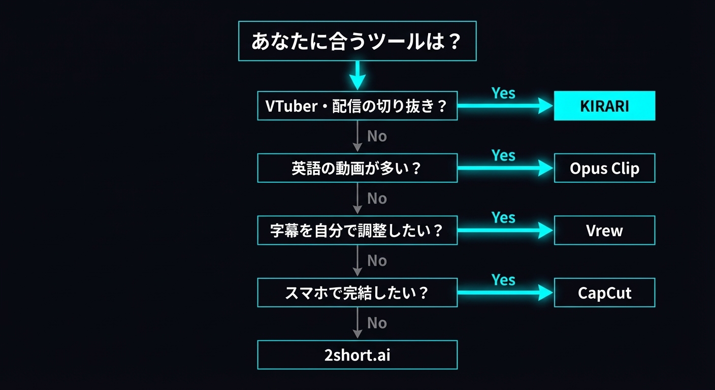 - 「どこが面白いか」まで自動で見つけてほしい → KIRARI、Opus Clip、2short.ai