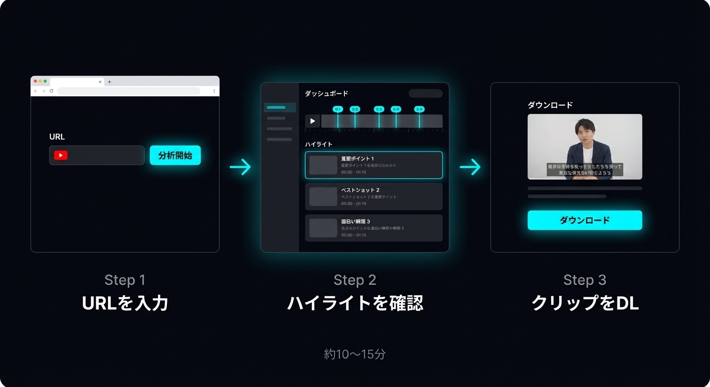 - 分析結果の確認: AIが提案したハイライトの中から投稿するクリップを選定(10〜15分)