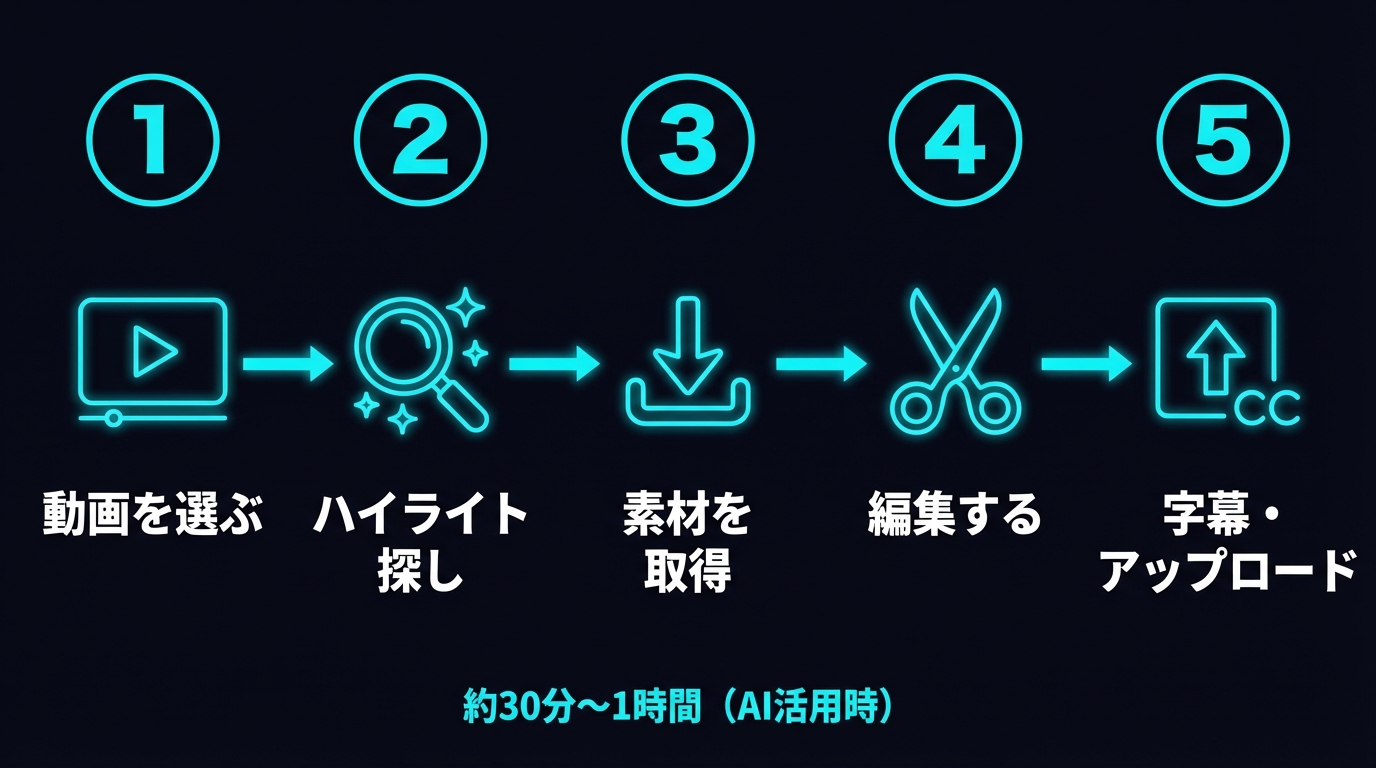 手作業の場合、5分の切り抜き動画で3〜5時間が目安です。内訳はハイライト探し(1〜2時間)、カット編集(30分〜1時間)、字幕(1〜2時間)。AIツールを使えば30分〜1時間まで短縮できます。週3本ペースで投稿するなら、AIツールの導入を強くおすすめします。