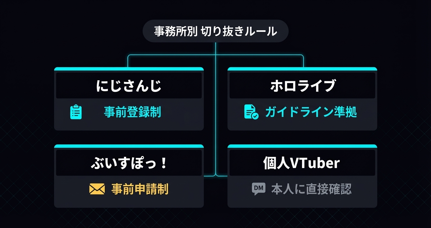 事務所によって「OK」の意味が異なります。にじさんじは「登録してからOK」、ホロライブは「二次創作ガイドラインに準拠すればOK」、ぶいすぽは「申請して許可をもらったらOK」です。「切り抜きOK」という情報だけで始めると、知らないうちに規約違反になる可能性があります。