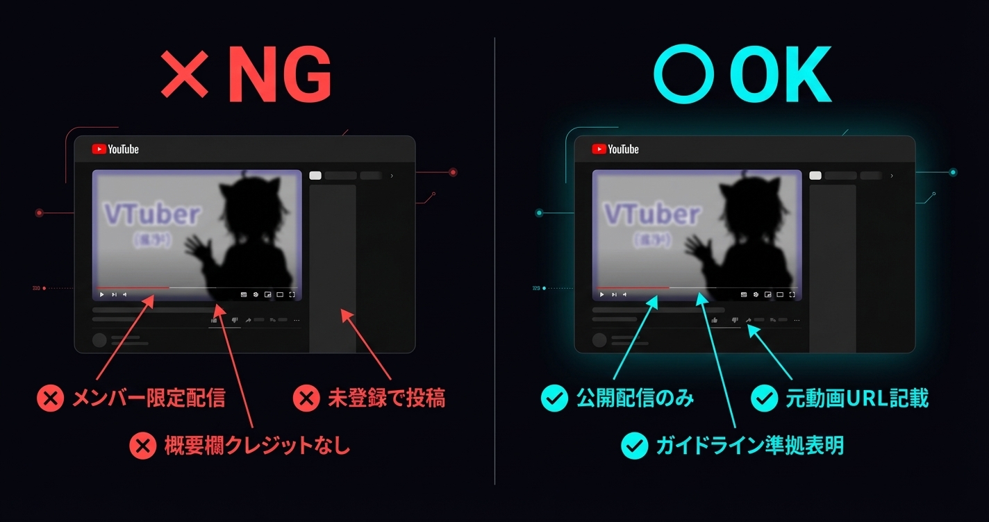 - コラボ配信の切り抜き — 複数のVTuberが出演している場合、全員の所属事務所のガイドラインに準拠する必要があります